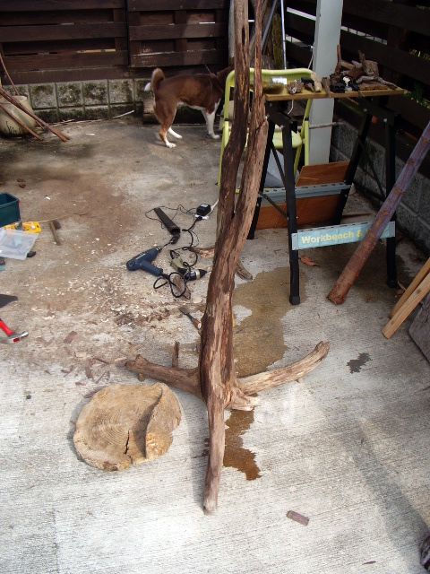 この時点で、流木の表面の柔らかくなった部分は、ワイヤブラシで削り落とす。(マスクをして作業しなければ、鼻の中が・・・えらいことになります(笑い))
