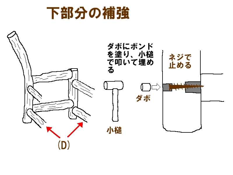 接合部分は、足の部分はドリルで深さ3cm程度の穴をあけ、補強材はドリル穴より1mm程度太くなるよう削り取る