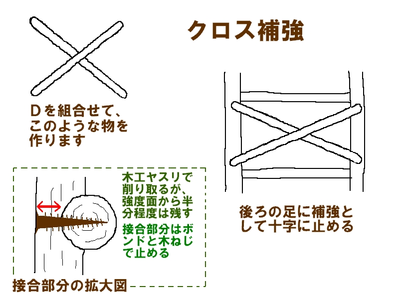 集めた流木を切る前に、簡単でも設計図を書いて長さの調整をしてください。下に書いた長さは目安で、正確ではありません。 ご自分の足の長さで変わります。