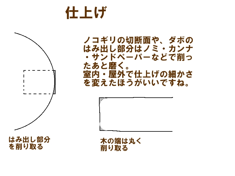 最後の一頑張りとして、仕上げ工程に入ります。 屋外で使用される場合は、細かな仕上げはかえって味が出ませんので、大まかに行ってください。