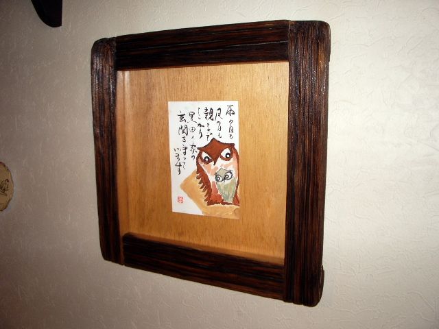 ここには、素朴な絵などを入れて楽しんでください。 切り出しの時は、正方形のサイズでしたが、組み上げて締め付けているうちに、正方形にはならなかった。。。